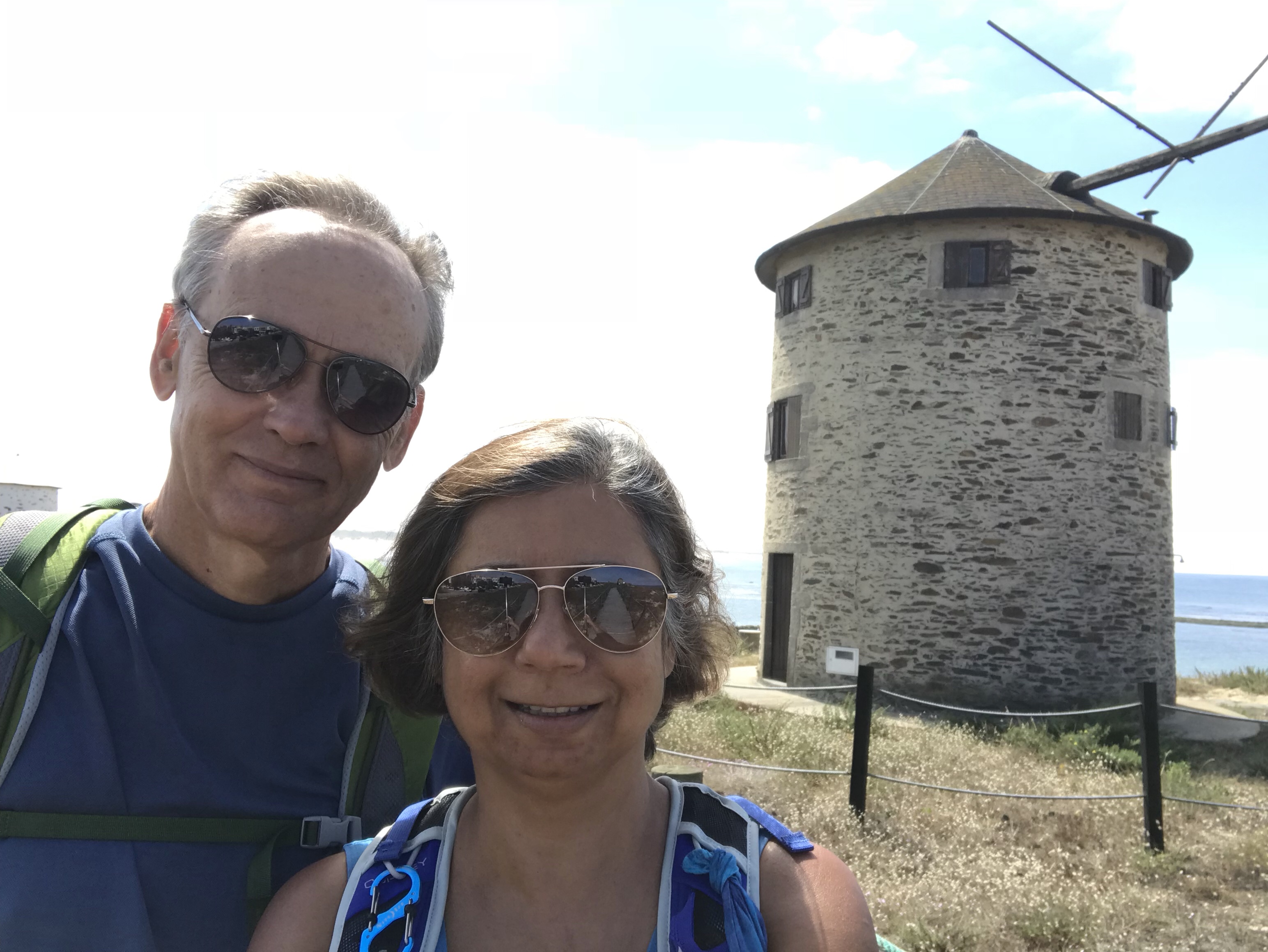 We started off on some lovely boardwalks, where we saw seaweed being dried and bundled after a harvest. Then the trail veered away from the coast so golfers could play with an on oceanfront course (!) where we passed lots of greenhouses and vegetable farms. We sampled the wild blackberries along the way, and wondered what it would be like to rent one of the windmill houses 😊. We had tripe stew (the jury is still out on that one!) off a Pilgrims menu, and finally, ended our day in the lovely town of Esposende!