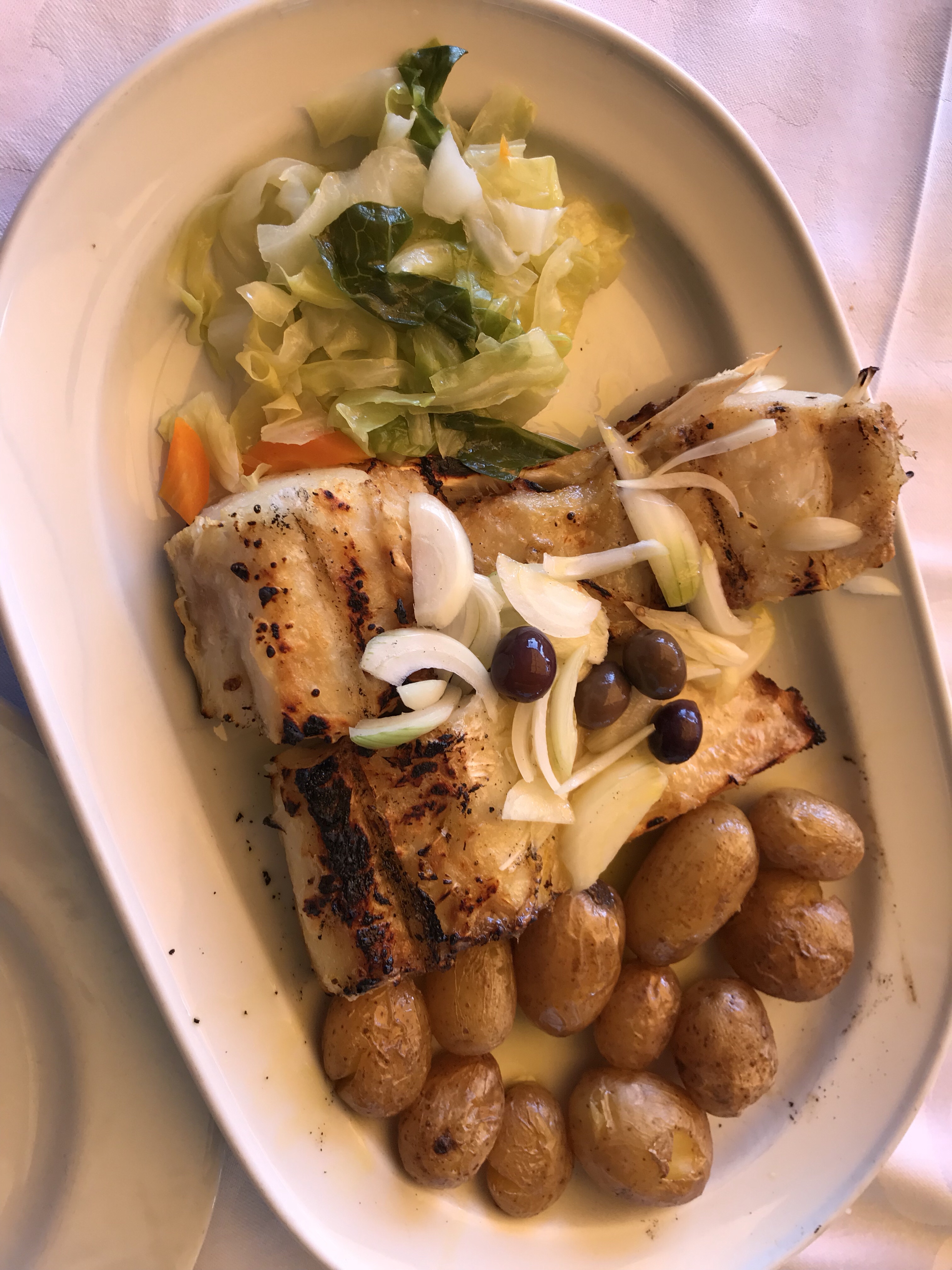 Grilled cod, roasted potatoes and a nod to vegetables for lunner!