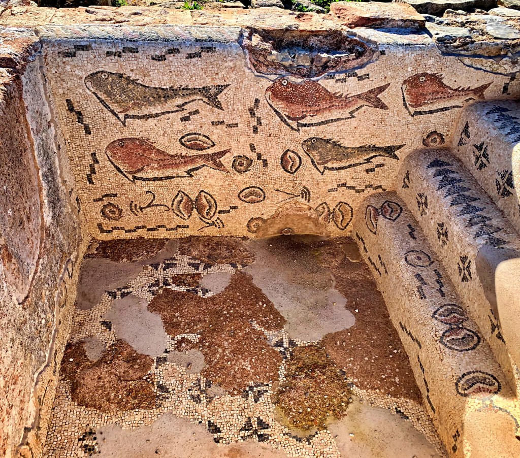 Extensive remodeling in the 3rd century included an interior garden with a water tank in the middle overlooked by an elaborate triclinium and some formal Roman baths, with heated water flowing underneath. Further embellishments in the 4th century included those wonderful fish mosaics we enjoy so much today and a pagan temple, which also featured mosaics of marine life. The temple was converted into a church 200 years later, as can be seen from the addition of a baptismal font.
