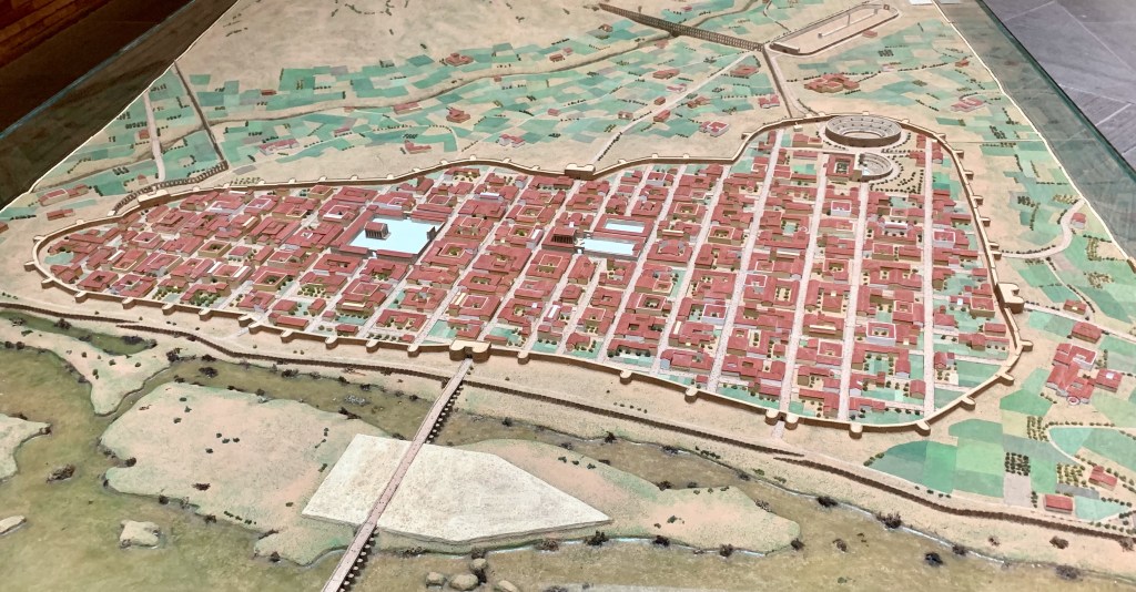 The amphitheatre, a smaller version of the Colosseum in Rome, was designed to hold about 15,000 spectators, gladiator fights being a top-drawer entertainment. As you walk through the dark tunnels underneath the stone bleachers, you can view poster boards illustrating the various categories of gladiator and their equipment. The Retiarius, for example, is the guy who tries to ensnare you in his net and then poke you to death with his pitchfork. The Secutor is more heavily armored, with helmut, shield and spear. Would you rather have all that protection or be light on your feet, like the Retiarius?