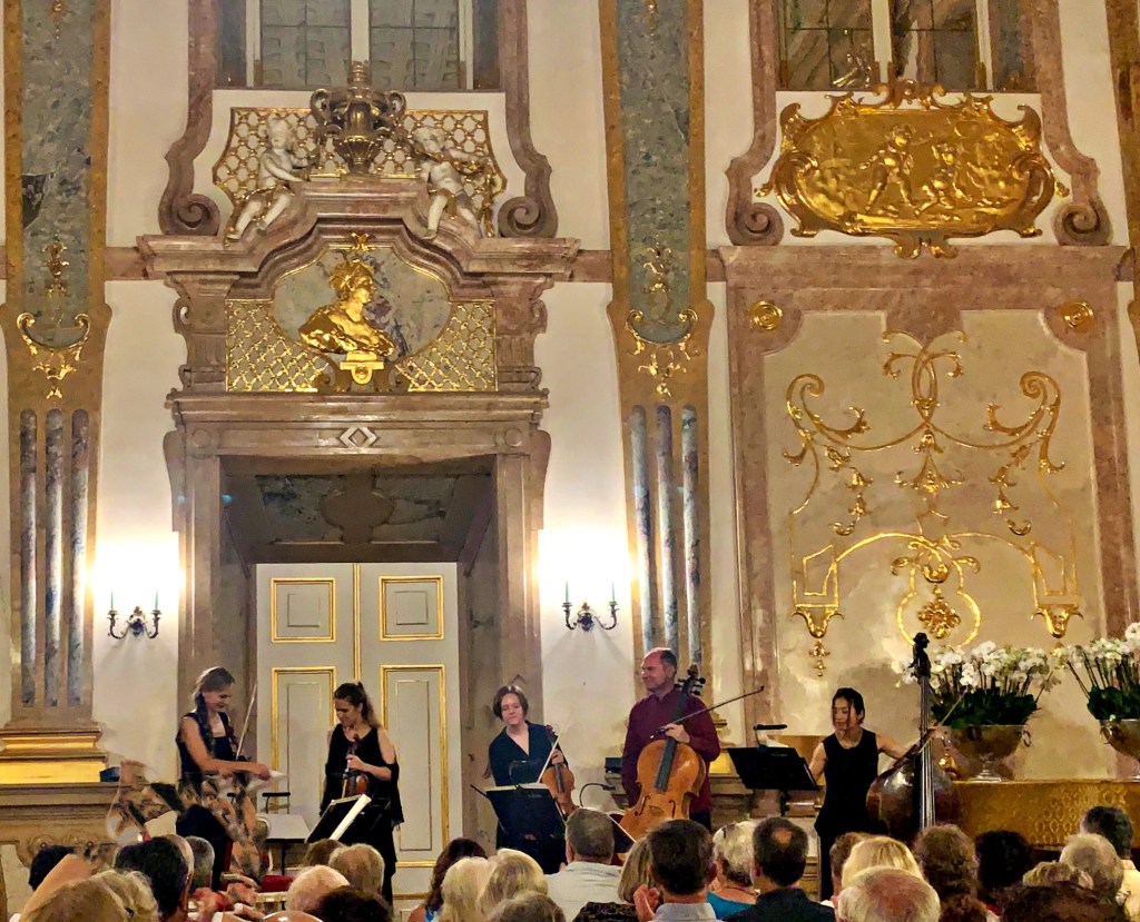 Bina and I enjoyed several Mozart pieces at an evening concert by the Amadeus Consort Salzburg in the consummately elegant Marble Hall of the Mirabell Palace (more about the palace later). The featured clarinetist, Marius Birtea from Romania, stood out particularly and got a standing ovation at the end after the group performed an encore from “The Magic Flute.”
