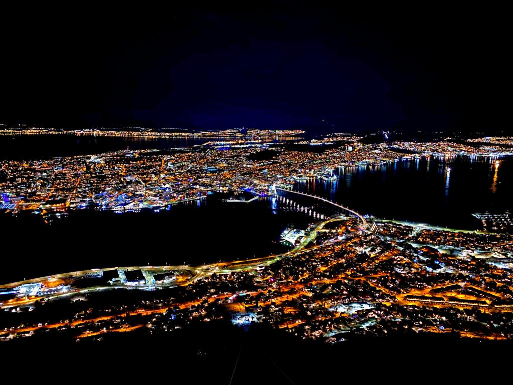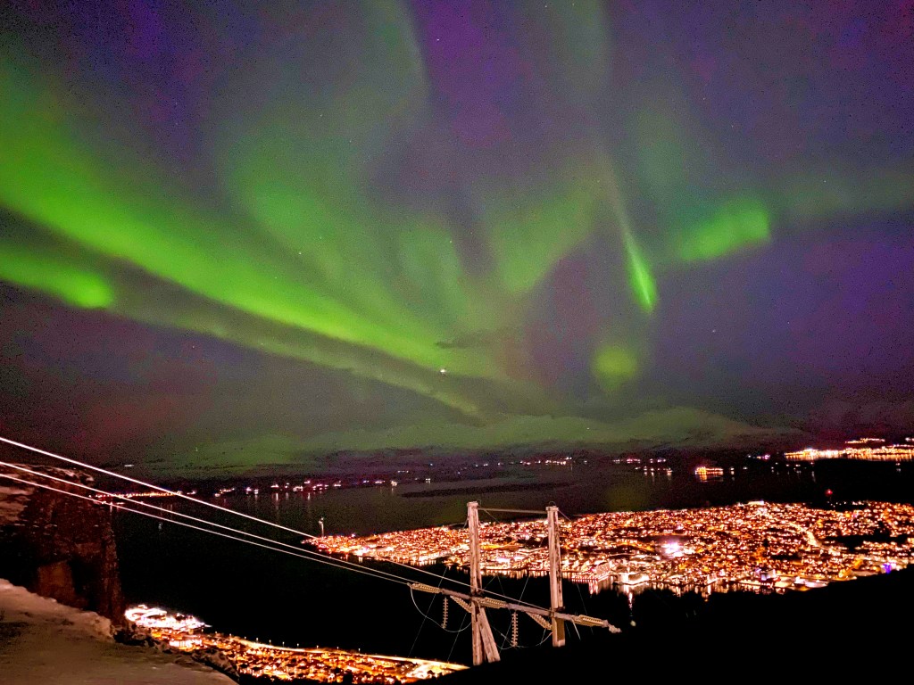 Viewing the aurora from the Tromsø pier was not ideal because of the light pollution rising up from the city and harbor. On Alex’s suggestion, the three of us next took a taxi across the bay to Fjellheisen, a cable car that takes you 420 metres (1,380 ft) up a mountain overlooking Tromsø. There, on the frigid observation deck, we could see the Northern Lights dancing with our naked eyes.