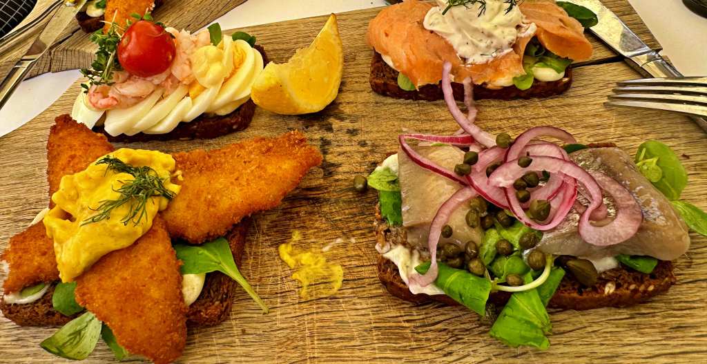 For our now late lunch, we returned to Nyhavn because we knew some of the restaurants there served Smørrebrød. This is the traditional Danish dish consisting of a slice of rye bread piled with various toppings such as pickled herring, roast beef, eggs and shrimp; we could not leave Denmark without trying that, at least once. It is tasty and filling.