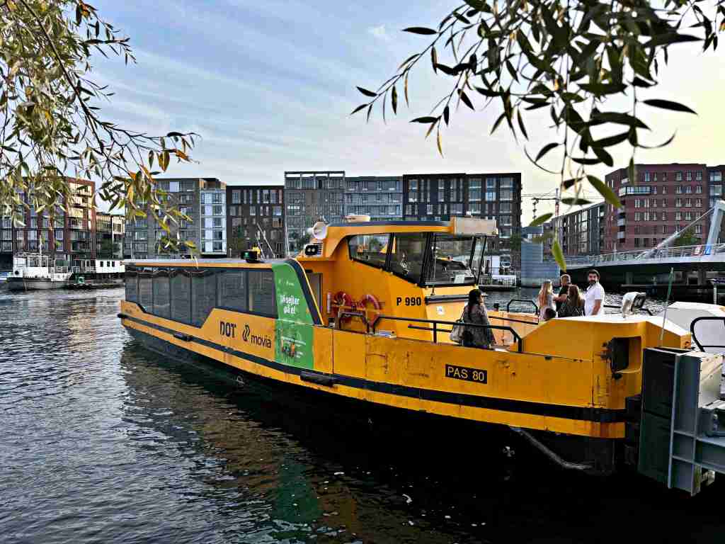 To finish our wander around Copenhagen, we followed up on one of Jacqueline’s suggestions and boarded a “water bus” at the pier near the royal theatre. These large yellow boats, all electric-powered, do indeed operate like buses, stopping at various locations along the canals. It’s the cheapest way to move around the harbor.
