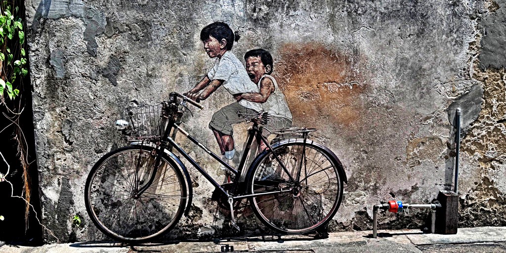 In walking around the streets of old George Town, we enjoyed the murals painted by Lithuanian artist Ernest Zacharevic. Featuring local street scenes of young people at play, these paintings incorporate physical elements, such as a bicycle or swing, to provide a 3-D effect, so the images jump out at you. They’re guaranteed to elicit a smile.