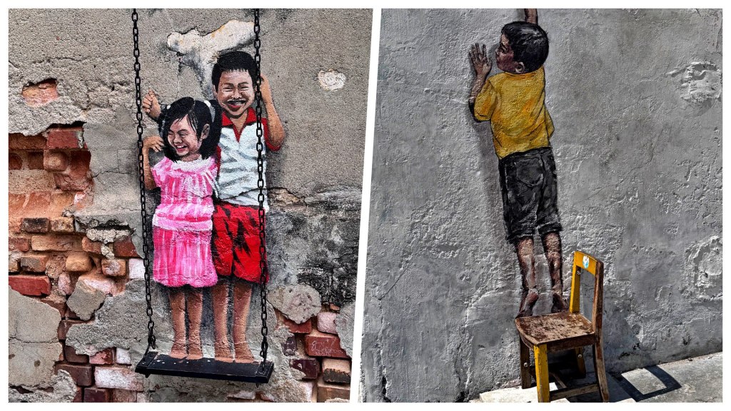 The images have become so popular that they appear on T-shirts and other souvenirs sold in the sidewalk shops. Since the paint fades over time, Zacharevic, who lives in Penang, spent three weeks restoring them in 2024, 12 years after painting the originals.