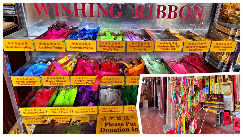 The “wishing ribbons” particulalry caught our attention. Buddhists who visit these temples attach the ribbons, which feature requests for good luck, success and/or happiness, to tree-like hangers. The worshippers hope to solicit the helpful attention of Buddha or some other deity celebrated in that particular temple.