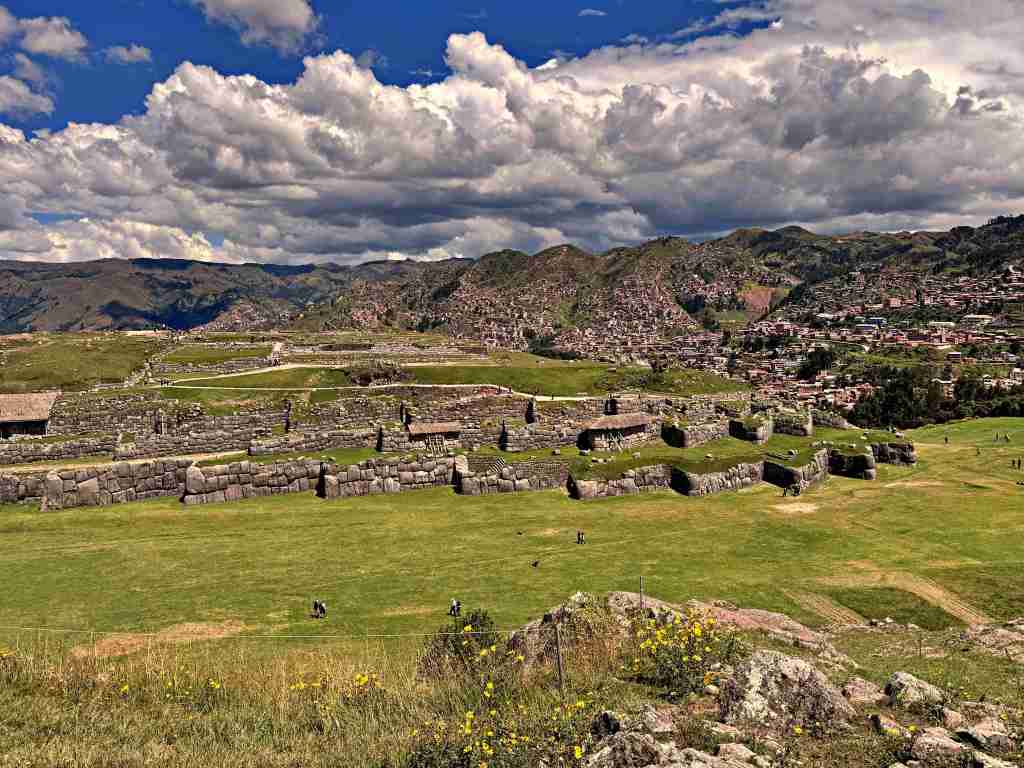 Even in its current ruined state, Sacsayhuamán is monumental: a walled complex covering 7,400 acres (3,000 hectares) sprawling on a plateau overlooking modern Cusco. Inca builders transported enormous stones to the site, one weighing 125 tons, trimming and polishing them to fit into the walls.