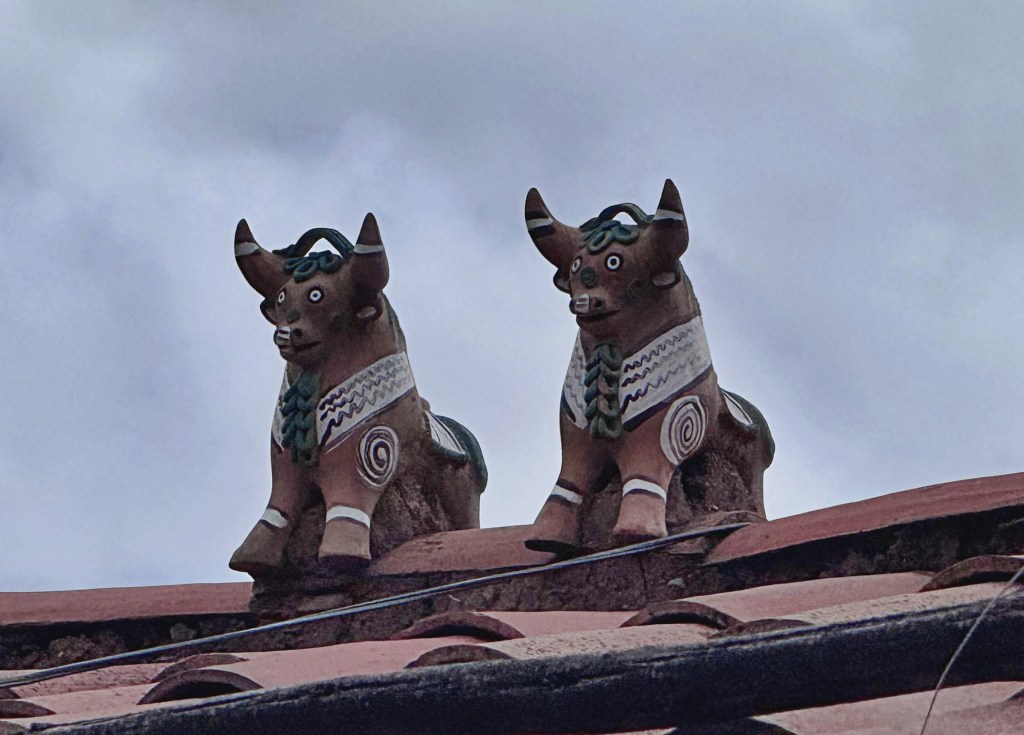 We parked about 10 minutes away from the archaeological site to walk to the park, noticing along the way small ceramic bulls sitting atop some houses. Known as Toritos de Pucará (“bulls of Pucará,” named for another town in Peru), Abraham told us that they are put there — often fronting a cross — to bring protection, fertility, and prosperity to the home.