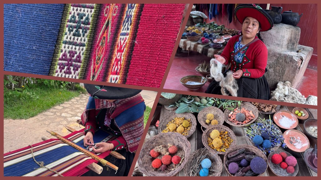 Following our visit to the Inca site, we dropped by one of town’s textile shops, where you can watch women in traditional costume weaving shawls, blankets, carpets and runners using old-style looms and authentic vegetable dyes. Bina bought a shawl and enjoyed feeding some llamas and alpacas kept in a corral there.
