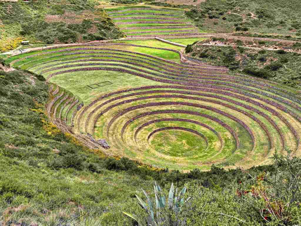 Likewise intriguing are the Moray terraces, which is a big hole in the ground (40 yards deep) in the shape of an inverted cone, with concentric terraces climbing the sides. The prevalent theory is that the Incas used the terraces as an outdoor greenhouse to test their crop seeds in varying microclimates, since the temperature at the rim is 27 degrees F. cooler than at the bottom. A recent study challenges this view, however, arguing that the site served religious/ceremonial purposes.