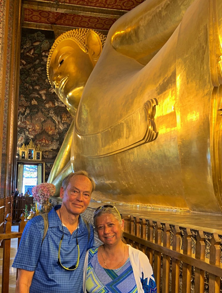 After an hour or so, reeling from both jet lag and the midday heat (36 C. or 97 F.), we exited the palace and walked for 10 minutes around its perimeter to visit one more attraction: Wat Pho, the temple of the the Reclining Buddha. This 19th century gold-plated sculpture is the largest representation in Thailand of a Buddha in the “reclining pose,” which depicts the great teacher’s passage into Nirvana, aka death.