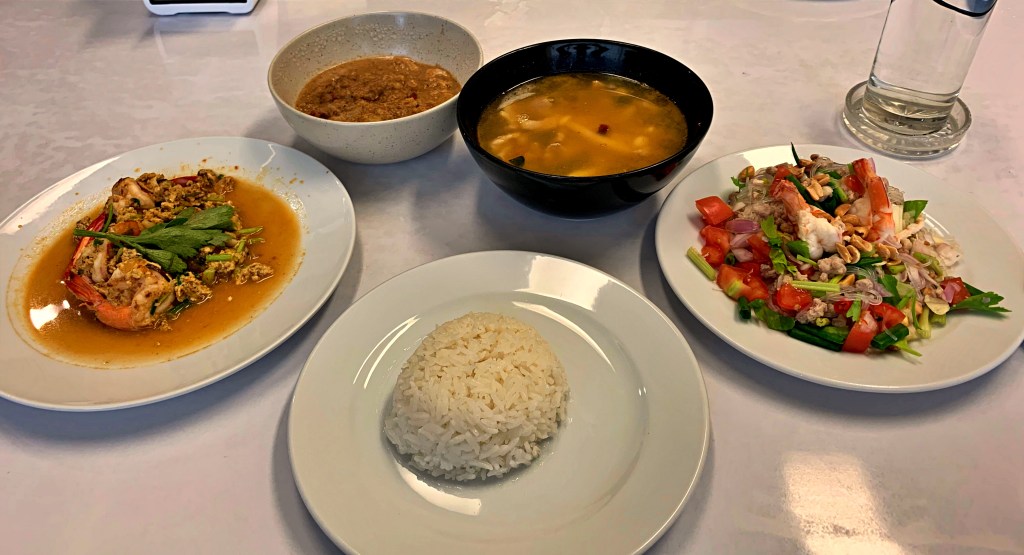 The afternoon passed in a lot of slicing, dicing and wok-ing as we made Massaman Curry with Chicken, hot and sour pork soup, stir-fried prawns with curry powder and egg, and spicy glass noodle salad. With the help of Mai and her two assistants everything turned out very well, even for me, although I over-spiced my soup. By 4 p.m. we were all tucking into a sumptuous late lunch.