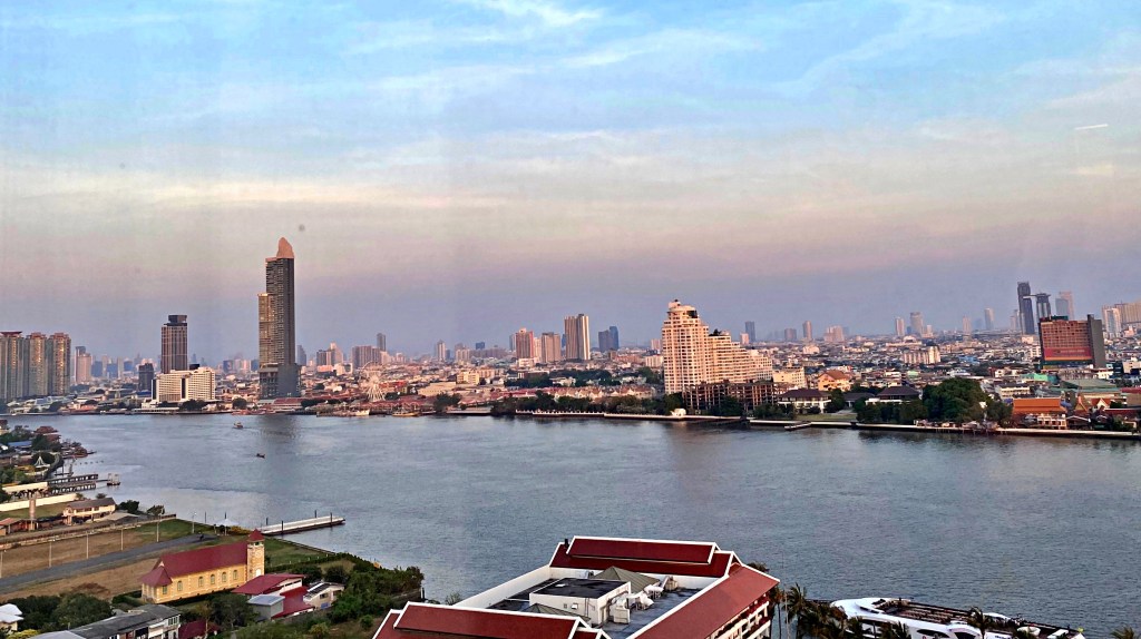 Linking up with our hired transport van at the exit gate took nearly an hour but we finally made it to the Avani Plus Riverside Hotel. Our room proved to be a good one, overlooking Bangkok’s main river, the Chao Praya. The lower two floors of the building also contained numerous shops and restaurants, including some familiar names: a 7-11, Burger King, Dairy Queen and Krispy Kreme donut stand. Not very exotic Asia, so far.